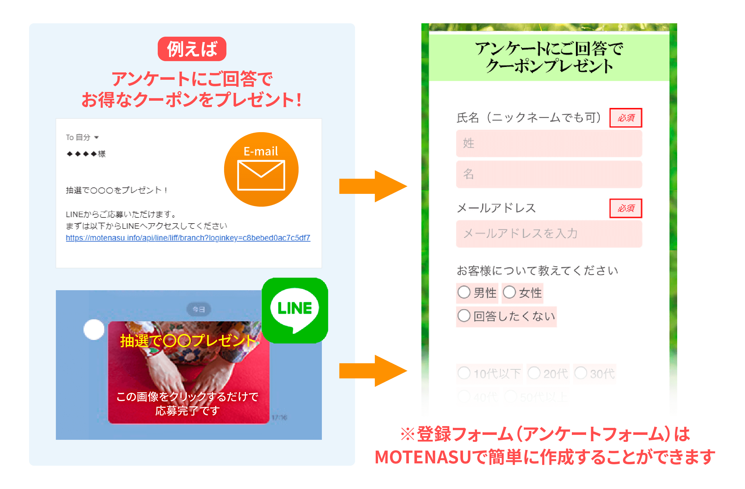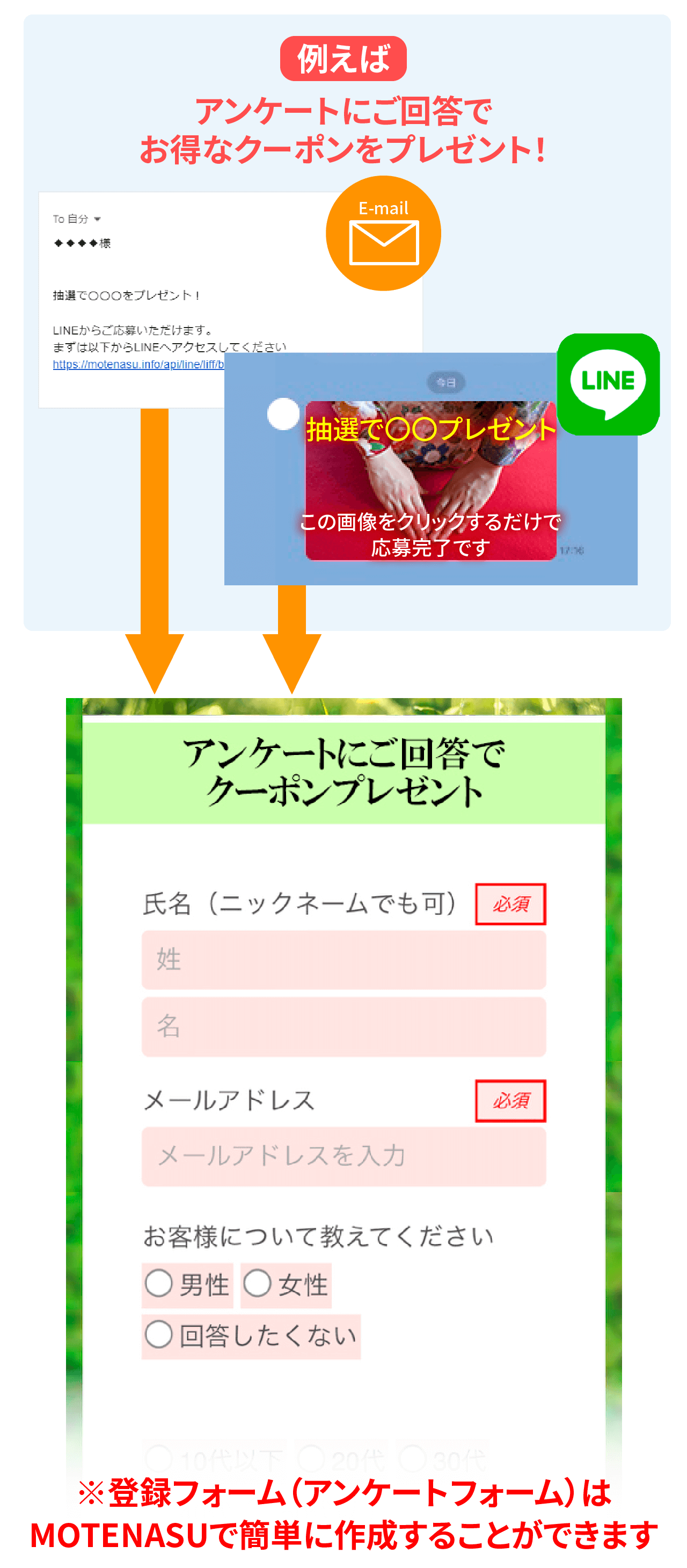 そうした場合はMOTENASUのフォーム機能を使って、LINE友だち登録時に簡単なアンケートを実施し、それらの情報を以降のCRM配信に活用することができます。